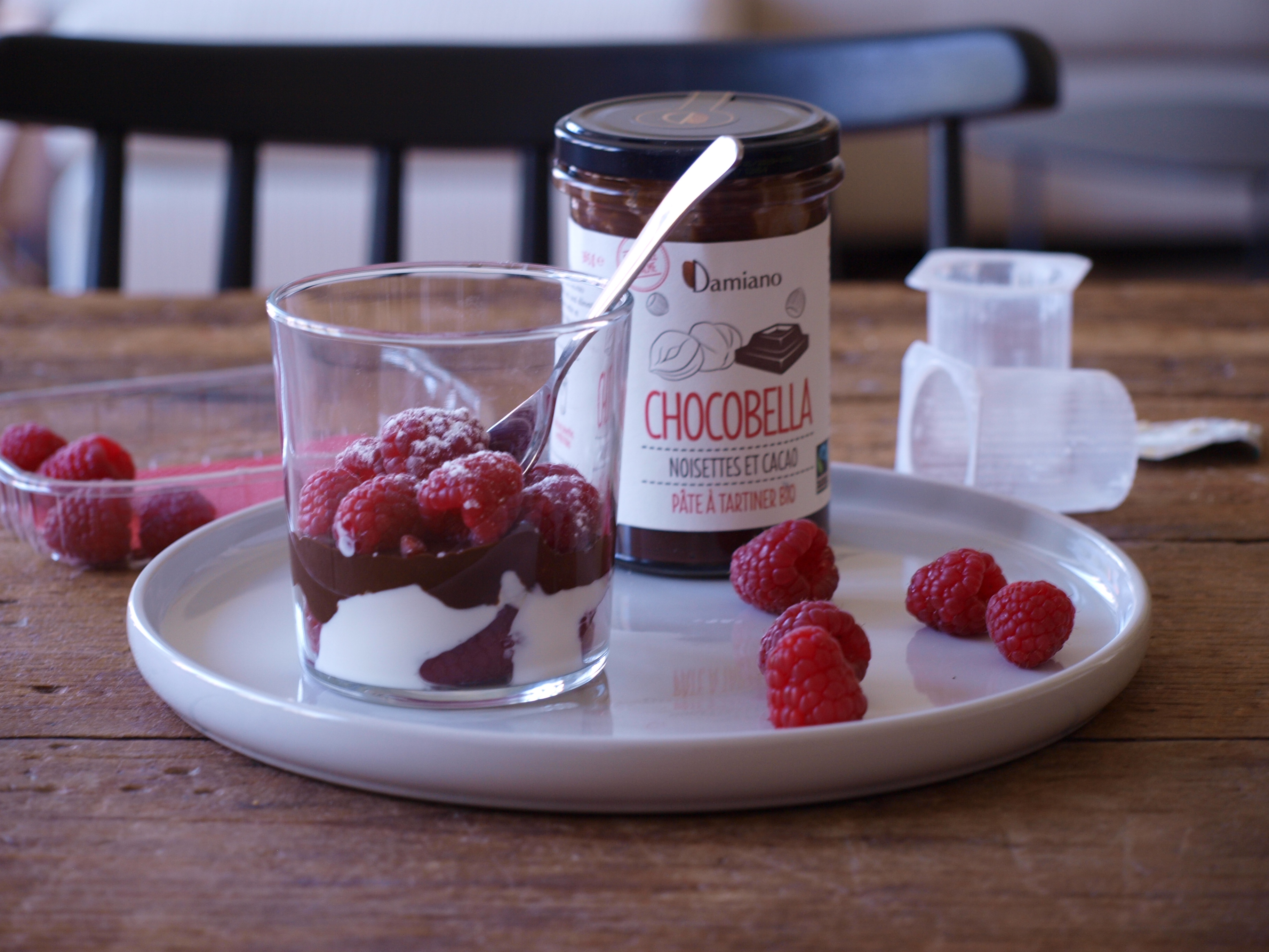 Prenez un beau verre ou une jolie coupe, et mettez au fond quelques framboises (du jardin c’est encore mieux !). Ajoutez une bonne quantité des deux petits-suisses préalablement fouettés. Puis ajoutez une cuillère à soupe généreuse de CHOCOBELLA, et agrémentez le tout de quelques framboises à nouveau. Saupoudrez d’un peu de sucre glace pour faire joli… et dégustez !