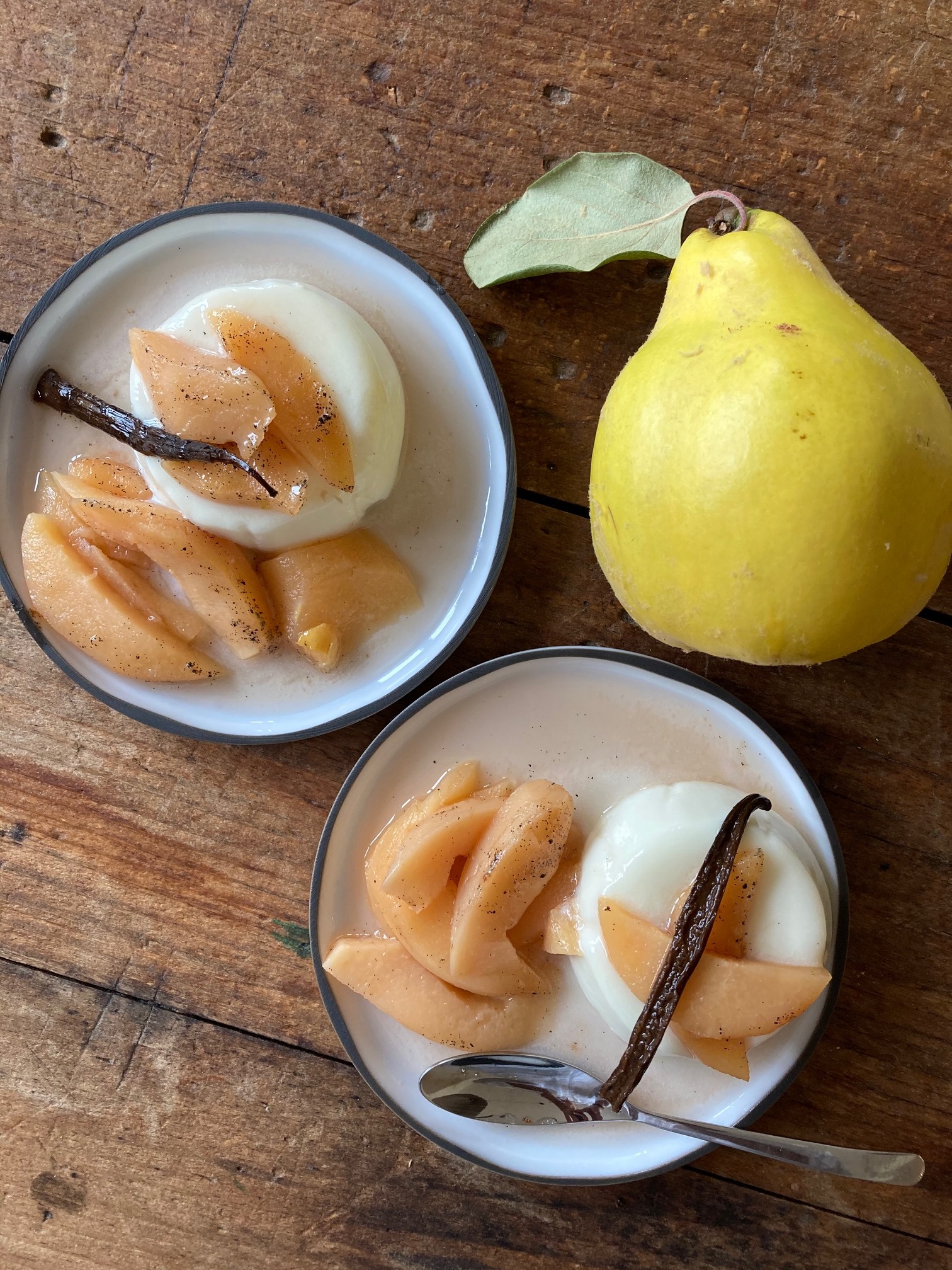 J’ai fait faire cette recette aux enfants, lors du dernier stage « Au four et au jardin », avec des poires à la place des coings. Mais là, en j’ai craqué pour les derniers coings trouvés au marché, pochés à la vanille de Madagascar. Moi qui n’aime pas d’habitude les panna cotta traditionnelles, à base de crème liquide (je les trouve lourdes et trop riches) j’ai été séduite par l’idée de remplacer la crème par du yaourt, ce qui fait toute la différence ! La recette n’est pas de ma création, elle est de Yotam Ottolenghi dans son livre « SWEET », où il les propose avec des fraises au basilic. J’ai eu envie d’adapter ce dessert tout simple avec les coings de saison que j’adore…